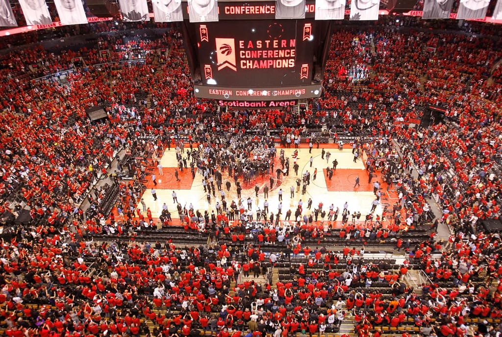 Dernière possession pour Toronto. Le ballon arrive dans les mains de Leonard, isolé dans le corner droit. Il déclenche un tir contesté, au-dessus de Joel Embiid. Le ballon s’élève, touche l’arceau… puis rebondit encore… et encore… avant de finalement tomber dans le panier au buzzer. La salle explose. Les Raptors s’imposent 92-90 et remportent la série 4-3.
